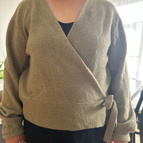 & Other Stories cardigan for dame i størrelse S. Omslagsmodell med knytebelte i livet og lange ermer. Strikket i akryl i en grønn farge. Passer som lett ytterlag eller til bruk inne over topp eller kjole.