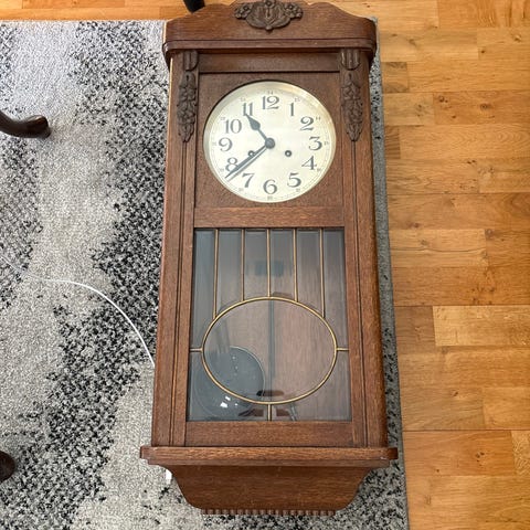 Veggklokke pendelklokke i mørkt tre. Klokken har utskåret trekasse med dekorative detaljer og glassdør i front. Urskiven har romertall og to visere. Pendel og underliggende rund mekanisk del er synlig gjennom glasset. Klokken er beregnet for veggmontering innendørs og drives av mekanisk urverk med pendel. Passer som tidsmåler og innredningselement i stue, gang eller lignende rom.