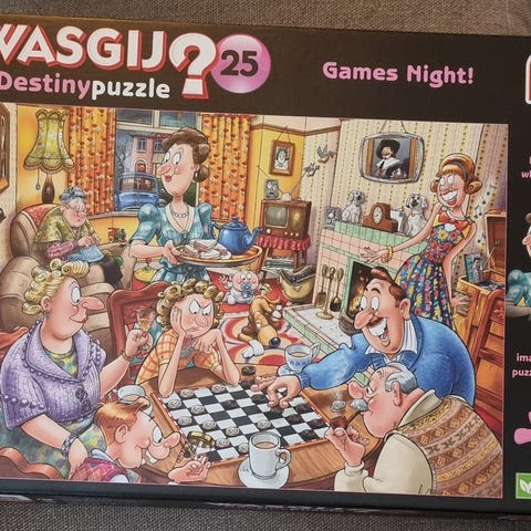 Jumbo Wasgij Mystery Puzzle 26 Date Night! puslespill med 1000 brikker. Motiv med humoristisk selskaps- og restaurantscene. Puslespillet tilhører Wasgij Mystery-serien, der man legger et annet motiv enn det som vises på esken, basert på ledetråder i illustrasjonen. Egnet for voksne og eldre barn som liker utfordrende puslespill og detaljrike motiver.