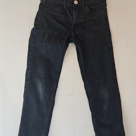 H&M Skinny Fit denim bukse for barn i størrelse 134 selges rimelig. Prøvd av jente, men tror det er unisexmodell. Svart farge. Buksa er laget hovedsakelig av bomull med noe elastan for stretch og komfort. Glidelås og knapp i livet. Passer til hverdagsbruk for både gutter og jenter. Knapt brukt.