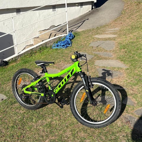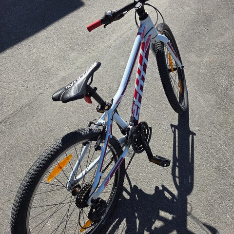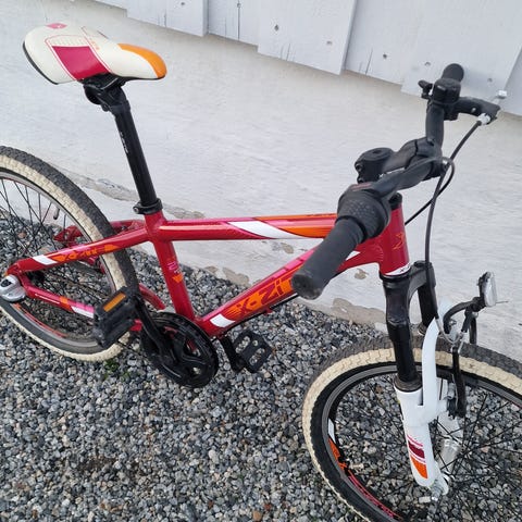 Scott barnesykkel med 20" hjul. Sykkelen har ramme tilpasset barn, dempergaffel foran og gir bak. Den leveres med felgbremser, grove dekk som egner seg til både grus og asfalt, samt reflektorer på hjulene. Fargekombinasjon hvit med røde og blå detaljer. Passer som hverdagssykkel og til turbruk for barn som skal over fra mindre barnesykkel til større modell med gir.