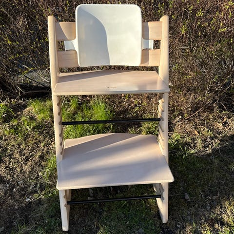 Baby Set med brett er ergonomisk beregnet for barn fra 6 mnd til 3 år. Kan suppleres med Stokkes brett, sele og putesett. Noen bruksmerker / patina (se bilder) - evt så kan den pusses ned og males. Må hentes.