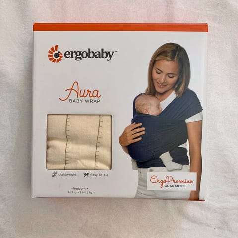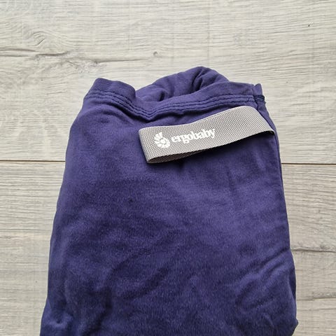 Skjønn blåfarge med prikker (slik som på første bilde). Kun vasket og prøvd på. Hadde ingen bæresjalbaby. De to siste bildene er for å vise passform/bruk.