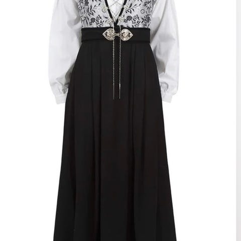 Amalie Norsk Festdrakt med skjorte i 100% bomull. Vest med flott broderidekor, kantebånd i fløyel og sølvfarget snor. Stakk i 50% ull med ekstra sømrom så den enkelt kan reguleres i lengde. Belte med flotte sølvfarget hekter. Festdrakten er i god utførelse og kvalitet og behagelig på. Et godt alternativ til bunad.