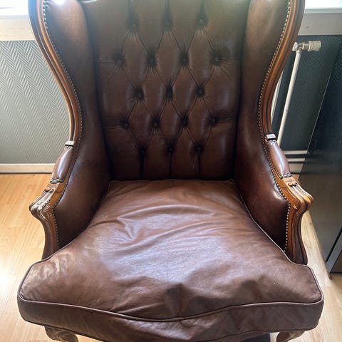 Skinnet har utviklet en vakker, naturlig patina som gir stolen karakter og et eksklusivt preg – perfekt som statement-piece i stue, kontor eller lounge.