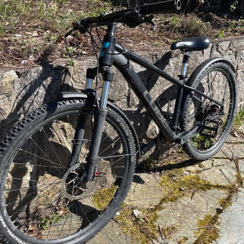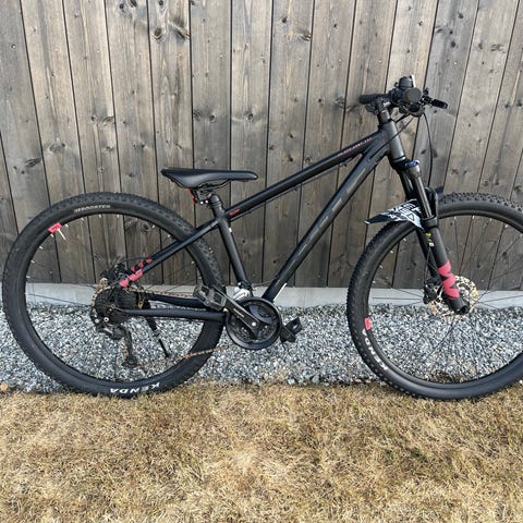 Tøff hardtail med grove knastedekk og Trek aluminium ramme. Dempegaffel fra Fusion Velvet, Tektro bremser og Sram GX gir. Kjøpt fra sykkelmontør som bygget sykkelen og brukt en sesong. Nylig kommet fra service på gir. Selges fordi han arvet større sykkel. Gutten på bilde er 140 cm.