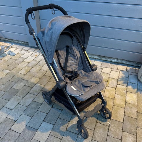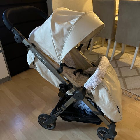 Selger en pent brukt twistshake vogn. Vognen har justerbar kalesje, frontbøyle og fempunktssele.