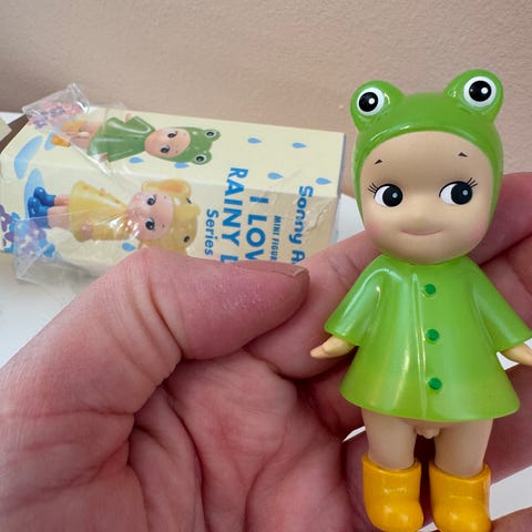 Sonny Angel dukker med dyrekostymer. Settet inneholder to figurer, én med andekostyme i gult med rød støvler og én med froskekostyme i grønt. Små samlefigurer som kan brukes som pynt eller lekefigurer.