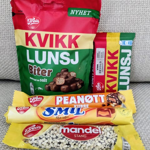 Freia Kvikk-Lunch kjeksjokolade med klassisk innpakning. pakket i folie med ytterpapir i rødt, beige og grønt med teksten «Kvikk-Lunch Kjekschokolade». Egner seg som samlerobjekt eller til dekorasjon for dem som er interessert i eldre emballasje og norsk sjokoladehistorie.