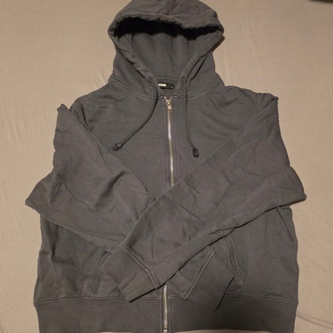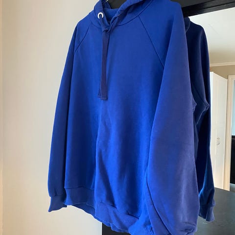 Weekday hettegenser for dame i størrelse L. Hettegenseren er blå og laget i bomull. Modellen har glidelås i front, justerbar hette med snøring og to frontlommer. Passer til hverdagsbruk og som et lag over t-skjorter eller topper.