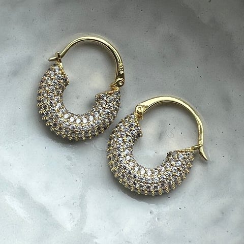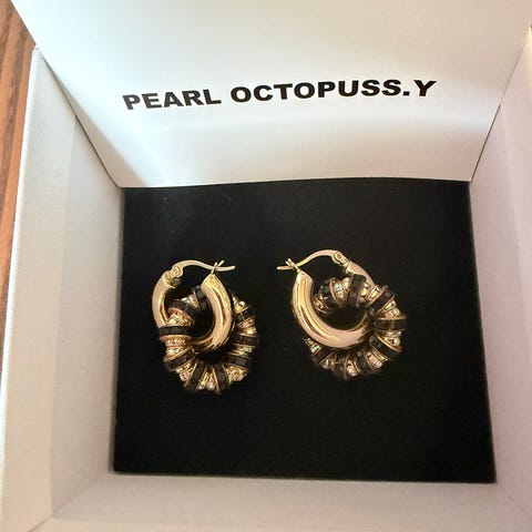 Pearl Octopuss.y øredobber for dame i gullbelagt metall med krystaller. Øredobbene har en rund form med krystallbesatte ringer som henger på små gullbelagte hoops. Ubrukt, selges med original pakning/oppbevaring.