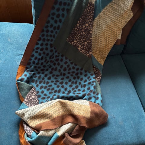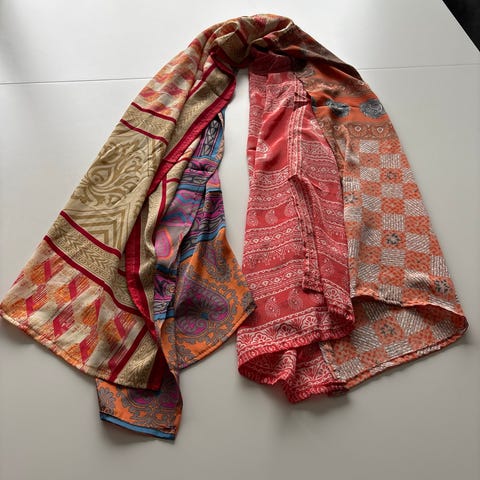 Flott og fargerikt skjerf i korall, ulike rosafarget og litt brunt, kvalitet: 100% viskose, størrelse: 100 cm x 180cm, brukt noen få ganger og fremstår som pent.