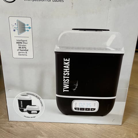 Twistshake flaske- og smokksterilisator i svart plast med gjennomsiktig lokk. Enheten har avtagbart lokk med ventilasjonsåpninger og varmeplate i bunnen for oppvarming av vann til dampsterilisering. Innvendig kurv med holdere for tåteflasker, smokker og tilbehør. Elektrisk tilkobling med ledning. Egnet til sterilisering av babyflasker, smokker og smådeler i plast og glass som tåler varme.