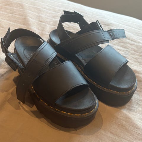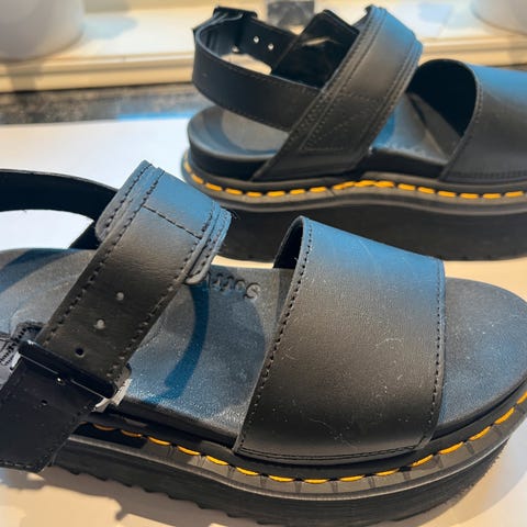 Dr. Martens sandaler i størrelse 38 EU. Modellen har kraftig platåsåle med karakteristiske gule sømmer langs kanten. Sandalene er svarte med brede remmer over foten og justerbar hælrem med spenne for bedre passform.