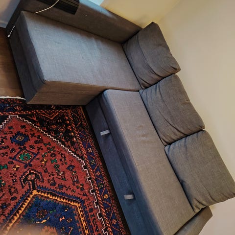 Grå sovesofa med oppbevaring selges billig. Den er ikke brukt så mye da den har ligget i felles området i annen etg som ekstra gjeste seng. Godt med lagringsplass.