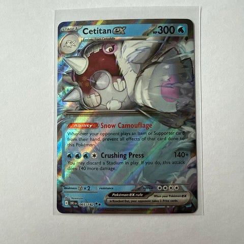 Pokémon Fezandipiti EX samlekort med holo-effekt. Kortet viser Fezandipiti EX med 210 HP og angrepstekster som «Flip the Script» og «Cruel Arrow». Standard Pokémon-bakside. Egnet for samling eller spill i Pokémon Trading Card Game. Kortet leveres i plastbeskyttelse på bildene, men selve kortet er i vanlig kortstørrelse for Pokémon TCG.
