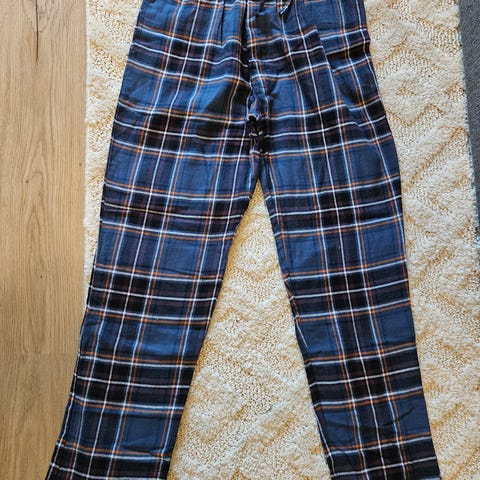 Grønn og svart rutete pysjbukse fra Sonoma i flanell. Noe nuppete, ellers fin. 60% bomull og 40% akryl. Kjøpt på episode og brukt noe som hjemmebukse. For stor for meg nå. Vil si den passer L mann og XL dame. Har lommer og knyting, samt strikk i livet.