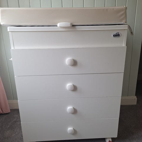 JLY stellekommode i hvit utførelse. Kommoden har stelleflate på toppen og oppbevaringsplass under med én skapdør og flere skuffer. Egnet til organisering av bleier, klær og annet utstyr til baby og småbarn på stelleplassen.
