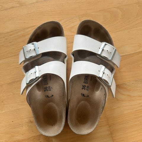 Birkenstock sandaler i størrelse 35. Modellen har tåstropp og justerbar rem med spenne over vristen, den heter Gizeh. Overdel i hvitt materiale og klassisk Birkenstock-fotseng. Kjempefint brukt!