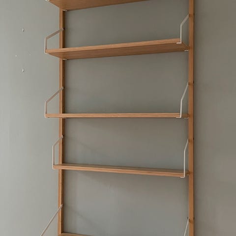 Selger pent brukte Stringhyller og gulvgavlar. Selges grunna vi ikkje har plass til i ny leilighet. Hyllene er i veldig fin stand med lite bruksmerker. Ei av hylleplatene har eit vannmerke etter etter ein vase. Det er ikkje veldig synlig og er nokså enkelt å dekke til.