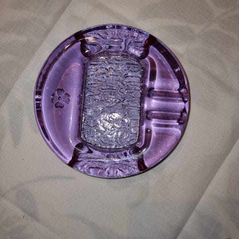 Glass askebegre i skulpturell form i to farger, ett turkis og ett brunt. Begge har organiske, bølgende kanter og tykt glass som gir en tung og stabil form. Egner seg som askebeger, skål eller dekorasjonsobjekt. Størrelsen fremgår av bildet med målebånd for omtrentlig mål.