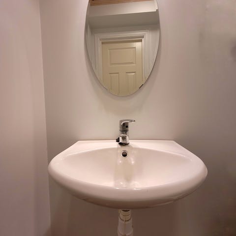 Det ene speilet er rundt med hvit ramme. Det andre speilet er rektangulært med bred, fasettslipt speilramme. Begge speilene kan brukes i gang, soverom, stue eller bad, avhengig av oppheng og plassering. Egnet til veggmontering der det er tilstrekkelig plass og egnet festeunderlag.