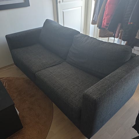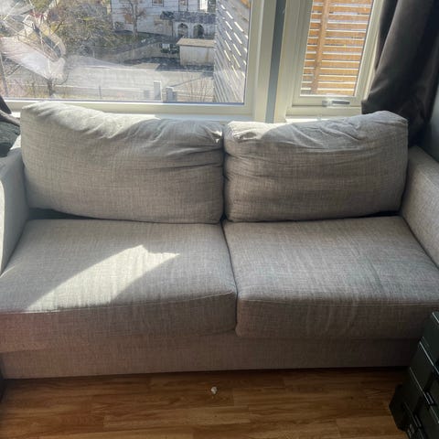 Sovesofa fra Møbelringen i beige tekstil. Sofaen har rette armlener og to sitteputer med tilhørende ryggputer og løse pynteputer. Den slås enkelt ut til seng med integrert madrass, egnet som gjesteseng eller for rom med begrenset plass. Nøytral farge og enkel.