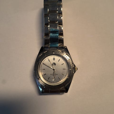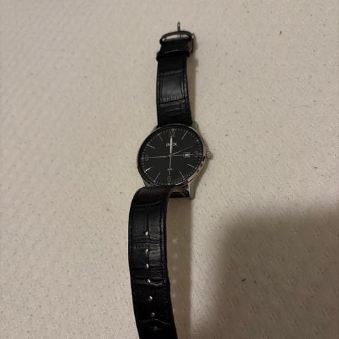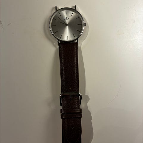 Inex herreklokke med analogt urverk. Klokken har rund sølvfarget urskive med tydelige timemarkeringer og datoindikator. Kassen og lenken er i sølvfarget metall med foldespenne. Passer som hverdagsklokke til herre. Nærmere modellbetegnelse og mål er ikke oppgitt.
