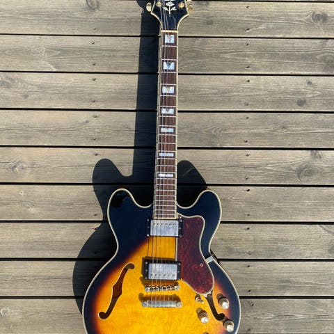 Epiphone Lucille elektrisk gitar i svart utførelse. Modellen er en halvakustisk elektrisk gitar med solid senterblokk og doble humbucker-pickuper. Kroppen har dobbel cutaway-konstruksjon og flere kontrollknapper for volum og tone, samt egen bryter for ulike pickup-kombinasjoner. Gitaren har gripebrett med blokkinnlegg, justerbar stol og gullfargede stemmeskruer og hardware. Egner seg til sjangre som blues, jazz og rock, og kan brukes både til øving, innspilling og live-spilling.