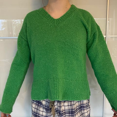 Mjuk og helt ubrukt hjemmestrikket ullgenser i fritt design, men med mål etter mønster i str S.