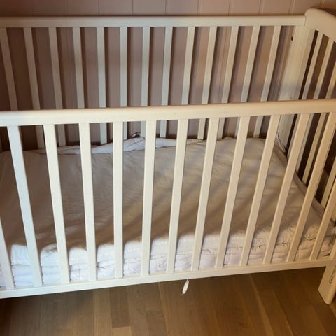 Pent brukt sprinkelseng med madrass fra barnas hus. Trekk på madrass er nyvasket. Bunnen på sengen kan justeres i to ulike høyder.