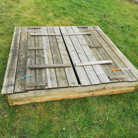 Sandkasse gis bort. 5 år gammel. Sand og duk til å ha under medfølger. To av lukene har delvis falt av som vist på bildet men kan nok enkelt monteres med nye hengsler.