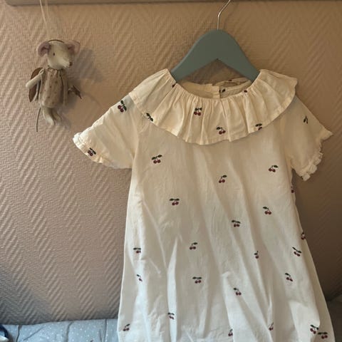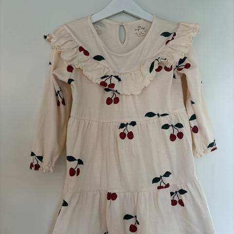 Konges Sløjd kjole til jente i størrelse 104. Kjolen er i beige bomullsstoff med struktur og kirsebærmønster. Modellen har lange ermer, rysjedetaljer på skuldrene og rynket skjørt som gir god vidde.