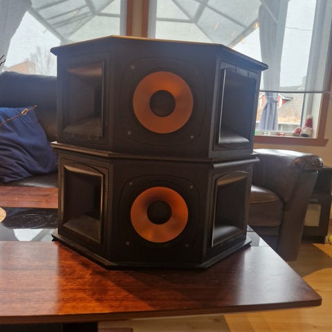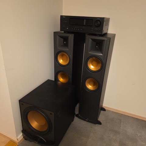 Godt brukte klipsch høytalere + en forsterker. 2 av dem kan henges på veggen. Alt skal fungere
