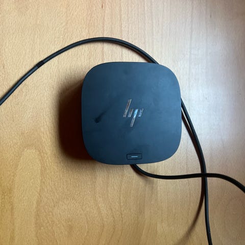 HP dokkingstasjon med strømforsyning i svart. Enheten har flere USB-porter, DisplayPort-tilkoblinger, HDMI, nettverksport (RJ45) og hodetelefonutgang. Leveres med strømadapter og tilhørende kabler for tilkobling av skjerm og PC. Egnet som tilleggsutstyr for bærbar PC der man ønsker å koble til eksterne skjermer og annet tilbehør via én samlet enhet. USB C tilkobling
