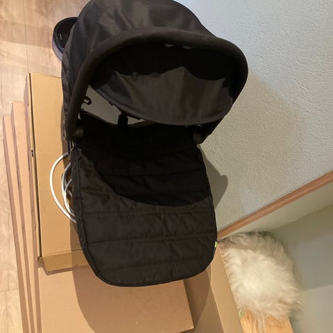 Baby Jogger bagdel i svart tekstil. Bagdelen har hette/kalesje og hvitt, vattert innerfôr med madrass. Den er egnet for bruk fra nyfødt og kan festes på kompatible Baby Jogger-barnevogner som separat liggedel. Passer til transport og soving for spedbarn når den er montert på riktig understell i henhold til produsentens anvisninger.