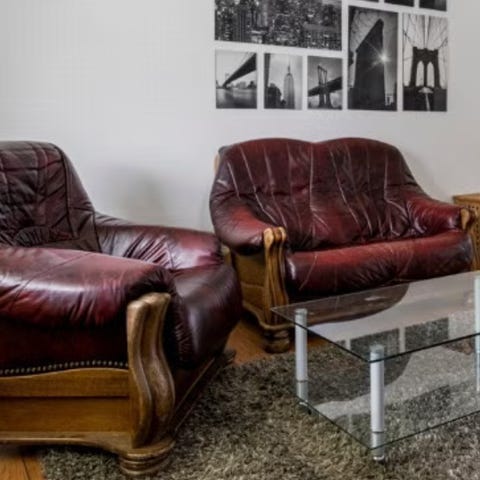 En siesta + en annen skinnstol av ukjent merke (muligens også Siesta, men usikker) i meget god sittestand. Den med armlen har skade på skinnet på ene armlenet og mangler 2 knapper i trekket. Ellers meget god.