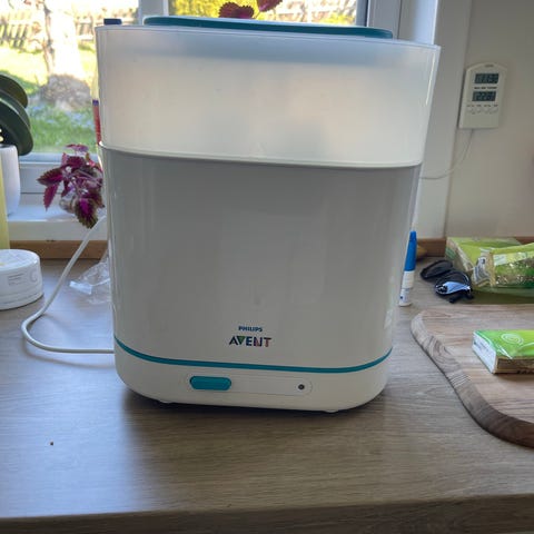 MAM elektrisk flaskevarmer og sterilisator i hvit plast. Apparatet er beregnet for oppvarming av tåteflasker og babymat, samt damping og sterilisering av flasker og tilbehør. Består av baseenhet med varmeplate, avtakbar bolle, innsatskurv og lokk. Kontrollpanelet har flere funksjoner for oppvarming og sterilisering. Egnet til bruk på kjøkkenbenk med standard strømtilkobling.