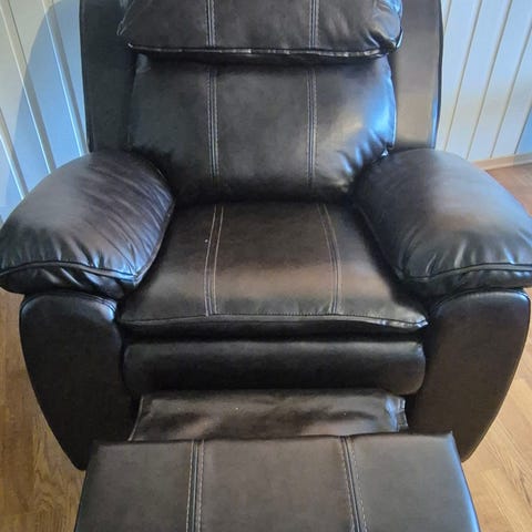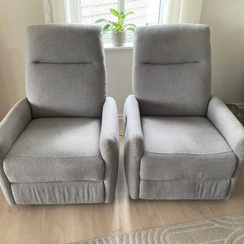 Lenestolene har innebygd reclinerfunksjon med uttrekkbar fotskammel og tilbakelent rygg, som gir mulighet for mer tilbakelent sittestilling. Passer til stue eller TV-krok som en enkeltstående lenestoler eller som del av en sittegruppe. Pris kr 1.000,- for begge samlet