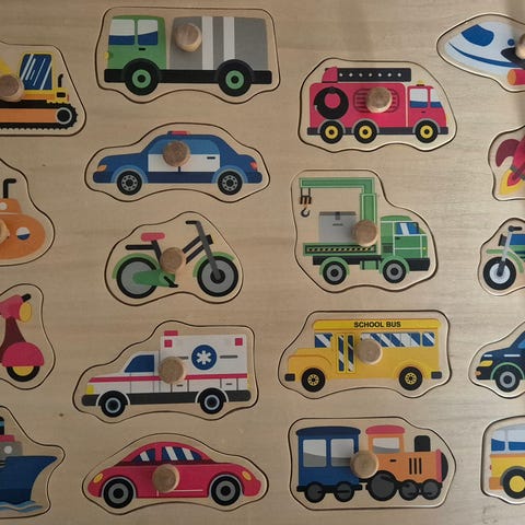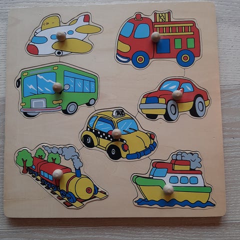 Trepuslespill med brannmann motiv. Puslespillet består av flere brikker med ulike illustrasjoner av brannmenn, brannbil og annet brannutstyr. Passer som aktivitetsleke for barn som liker brannvesen og kjøretøy. Laget i tre med fargerike trykk på brikkene. Fra et røyk og dyrefritt hjem.