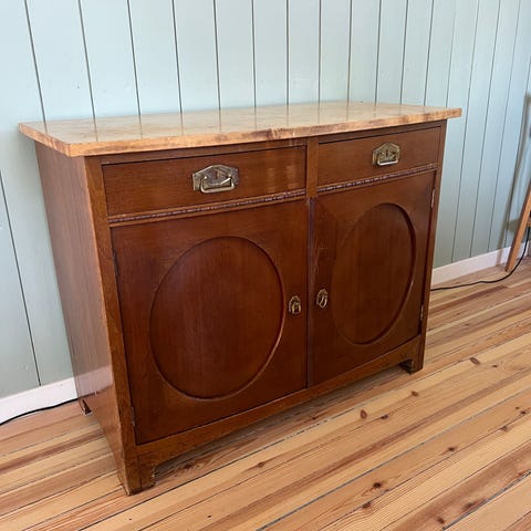 Eldre antikk skjenk med to skap og tre hyller. Hhv to og en hylle i hvert av skapene. Pluss bunnplata.