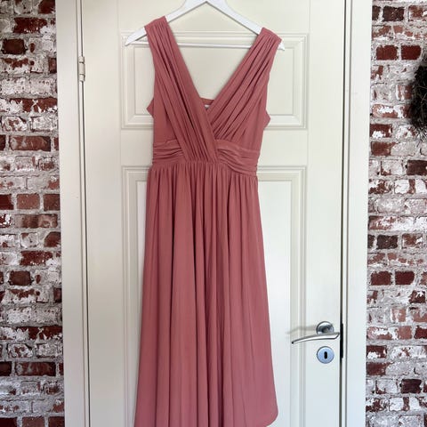Chiara Forthi festkjole i størrelse M for dame. Kjolen er rosa og laget i polyester. Modellen har brede stropper med dekorativ metallplate med logo, drapert overdel med omslagseffekt og markert liv. Skjørtet er vidt og faller asymmetrisk for et mykt uttrykk. Passer til formelle anledninger som selskap og fest.