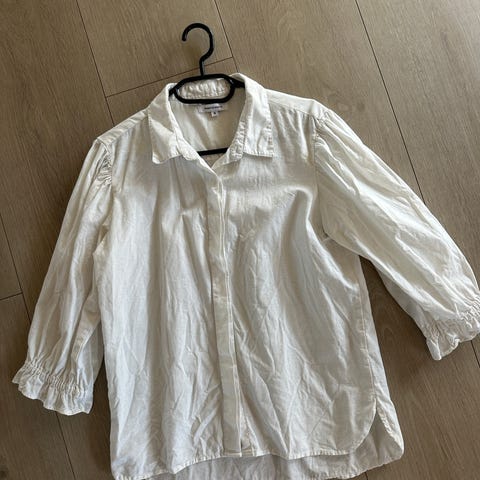 Mos Mosh bluse for dame i størrelse XS. Blusen er hvit og laget av bomull. Modellen har knappelukking foran, trekvartlange ermer med strikk nederst og rynkedetaljer langs utringningen. Skjorten kan dras ned for en «off-shoulder look». Passer til hverdagsbruk eller mer formelle anledninger, og kan kombineres med både bukser og skjørt.