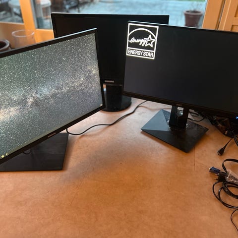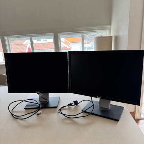 Selger 2 stk HP EliteDisplay 27" skjermer (modell E273). Perfekt til hjemmekontor, kontoroppsett eller dual-screen løsning. Skjermene er pent brukt og fungerer som de skal.