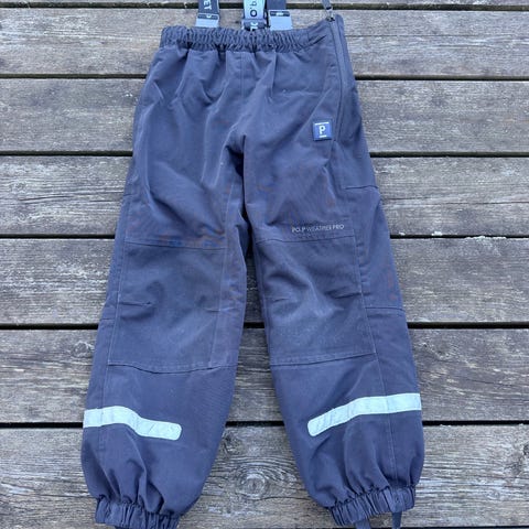 Blå Polarn O. Pyret skallbukse i størrelse 116. Strikken på den ene foten er noe slitt, men kan erstattes av nye
