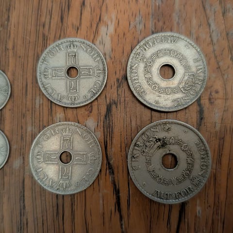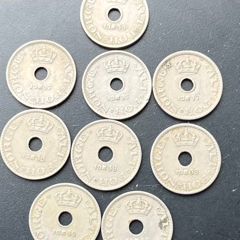 Flotte mynt med unntak av 1 kr 1958 - se vedlagte fotografi. Kjøper betaler frakt (Liten Norgespakke og porto, 96 kr)