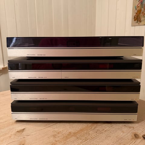 Bang & Olufsen hifidelkomponent stativ i rustfritt stål. Triangulær konstruksjon med åpning på siden og feste på toppen for montering av kompatibel Bang & Olufsen-enhet.