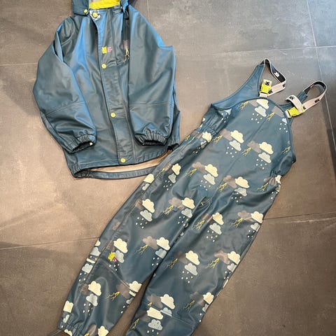 Kattnakken regnsett for barn i størrelse 128, unisex. Sett med jakke og bukse i grønn løvemønster.