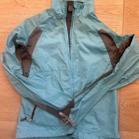 Bergans turjakke for dame i størrelse S. Jakken er i blå farge med mørke kontrastfelt i sidene og på ermene. Den har hette, gjennomgående glidelås foran og glidelåslommer i sidene. Lett og pakkbar jakke som egner seg til fotturer og annen utendørsaktivitet.