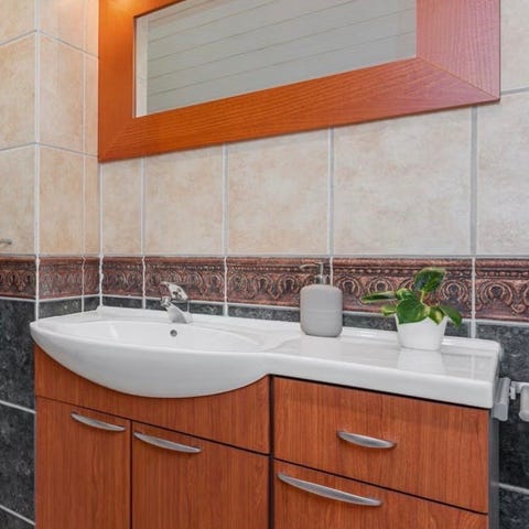 140 cm bred baderomsinnredning med servant og speil hvit topp mørkbrun skrog